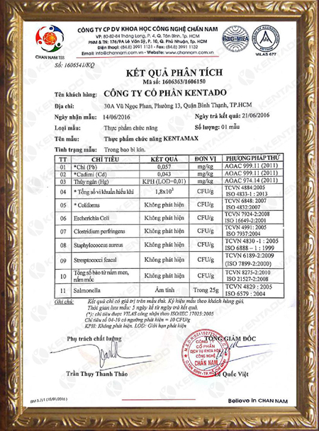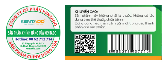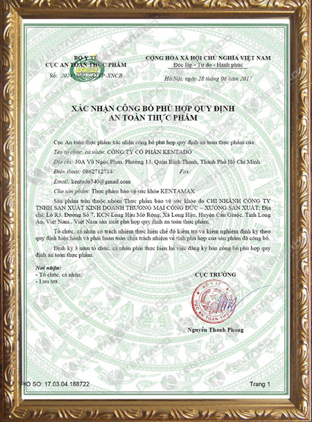 Sản phẩm của Công ty Cổ phần Kentado (Sản xuất tại Việt Nam) đã được Bộ Y Tế (Cục An Toàn Thực Phẩm) cấp giấy xác nhận lưu hành trên toàn quốc, giấy phép mới nhất số: 20241/2017/ATTP-XNCB.