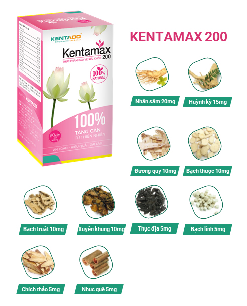Tăng cân Kentamax là sản phẩm tăng cân được chiết xuất hoàn toàn 100% từ thảo mộc tự nhiên. Giúp đào thải độc tố trong đường ruột ra ngoài cơ thể, gia tăng sự hấp thu dưỡng chất. Ngoài ra thuốc còn kích thích giúp ăn ngon miệng, ngủ sâu giấc, thanh nhiệt cơ thể, giúp tăng cân tự nhiên lâu dài an toàn, không có tác dụng phụ.